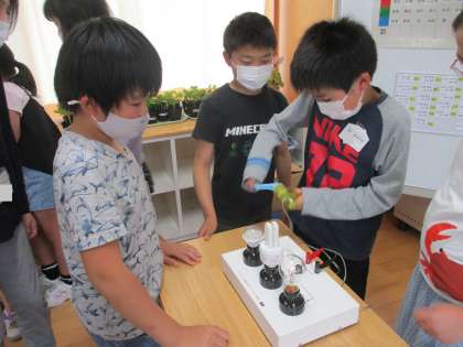 環境チャレンジ教室(4年生) 公開日 2022/06/14 更新日 2022/06/14 4年生 環境チャレンジ教室がありました。 外部の先生を招き、地球温暖化や食品ロスなどについて学びました。 手動で電気をつける大変さを体験する子供たちの様子です。