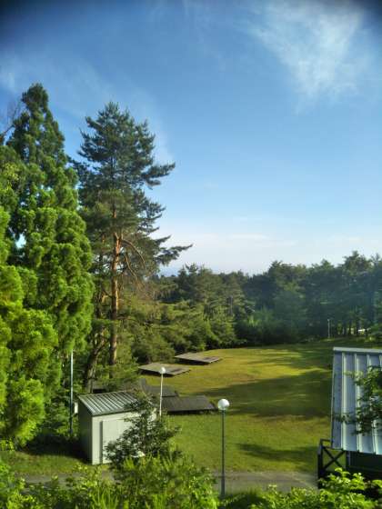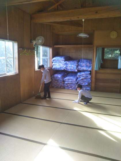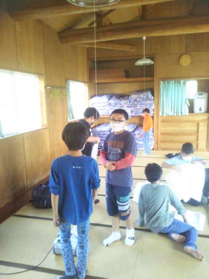 快晴です。 清掃をがんばっています。 今日は竹クラフト、野外炊飯(焼きそばづくり)です。