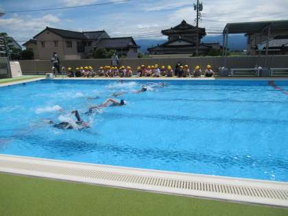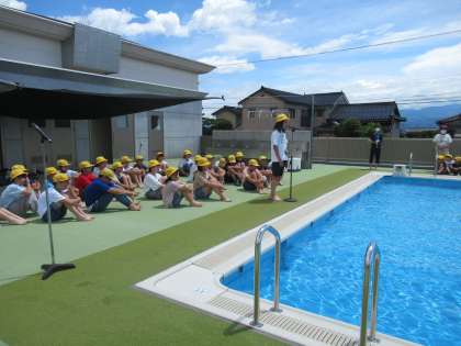 プール開きを行いました。プール使用の注意を聞いたり、代表児童による模範水泳を見たりしました。
