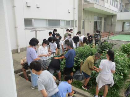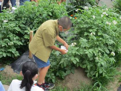 理科1 (6年生) 公開日 2022/06/28 更新日 2022/06/28 6年生 理科では、植物の体のはたらきについて学んでいます。日光が葉に当たると養分ができるのかを調べるために、アルミホイルで葉をおおっています。