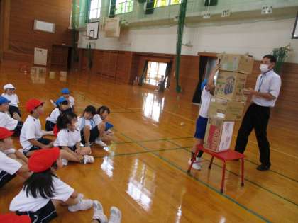 体育科の学習で的当てを楽しんでいます。どうするれば倒せるのか、段ボールの置き方や、ボールを投げる場所などを考えながら取り組んでいる子供たちです。