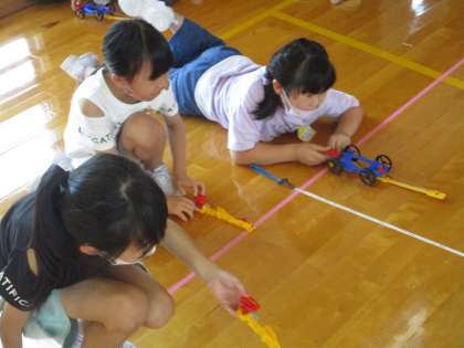 今日は、ゴムが1つのときと2つのときでは、どちらが遠くまで車が進むかを調べました。
