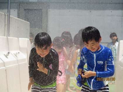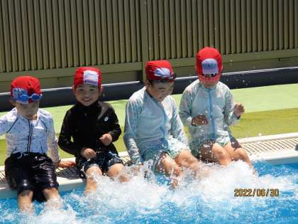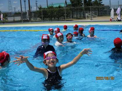 1年生でプール学習をしました。友達とバディを組み、水の中を移動したり、潜ったりしました。「あごまで(水につかることを)がんばったよ」「鼻をつまみながらだと潜ることができたよ」と楽しそうに活動しています。