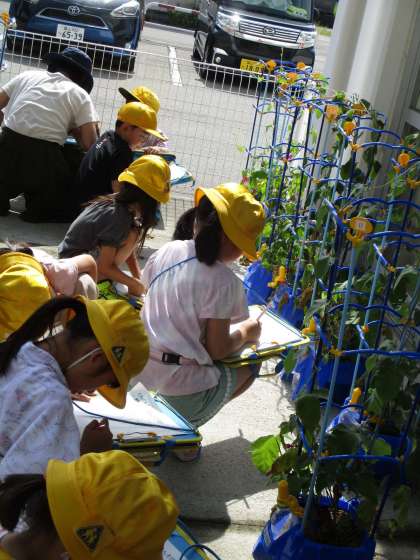 あさがおの観察(1年生) 公開日 2022/06/30 更新日 2022/06/30 1年生 朝顔の花が咲き始めました。朝、水やりをしに行くと「○○さんの朝顔に花が咲いているよ」「つぼみができている」と生長を喜んでいました。「いっぱい水をあげないと」とより育てることに一生懸命になっている子供たちです。