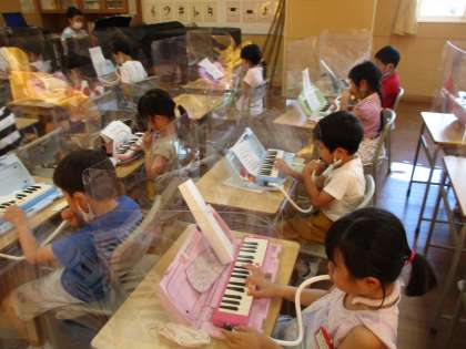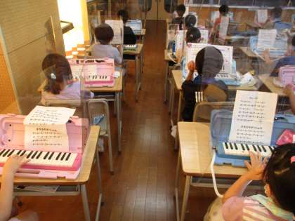音楽科の学習で、「かえるのうた」を鍵盤で吹く練習をしています。正しい運指とタンギングで演奏できるように、一生懸命な子供たちです。