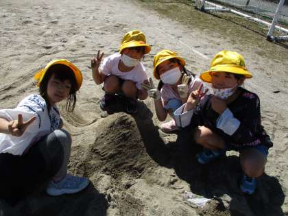 生活科で、砂や水を使って山やトンネルをつくりました。水やシャベルを使うときに、「貸して」「いいよ」と声をかけ合うなど、友達と仲良く活動しています。