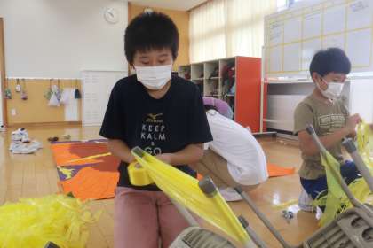 応援グッズ ポンポン作り (6年生) 公開日 2022/10/04 更新日 2022/10/04 6年生 各団で団員分のポンポンを作りました。合計90個ほど作ることを目指して作りました。先生方にも手伝っていただき、半分ほど作ることができました。