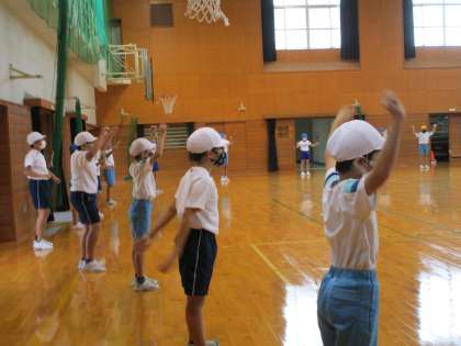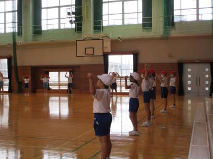 運動会の練習(5年) 公開日 2022/10/05 更新日 2022/10/05 5年生 全校演技の練習をしました。一つ一つの動きを大きくしたり、指先までをしっかりのばしたりするなど、下学年をリードできるように頑張っています。