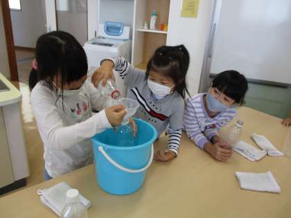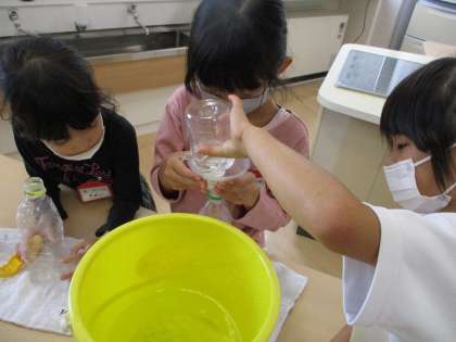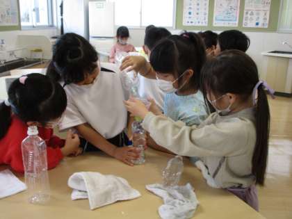 算数科「どちらがおおい」の学習で、アサガオの水やりに使っていたペットボトルの中で、誰の物が一番水が入るのか調べました。こぼさないように水を入れ替えて、あふれるかどうか、真剣に実験している子供たちの様子です。