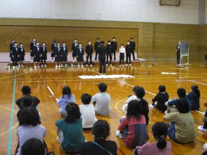 今日は、三成中学校の三年生と合唱練習を行いました。中学生は自分たちよりも少ない人数なのにきれいな歌声を響かせているところが印象に残ったようです。中学生に負けないように自分たちも精一杯の歌声を披露してきました。来週の火曜日は校内発表会です。今日の反省を生かして頑張ろう!