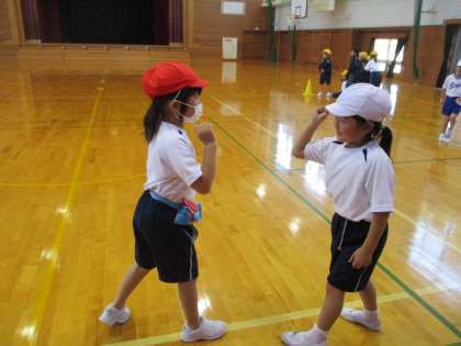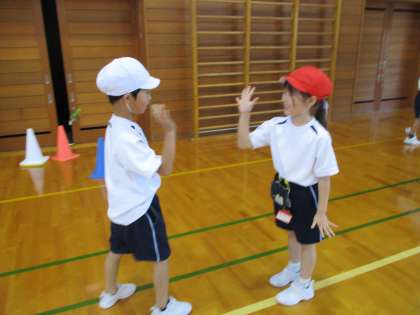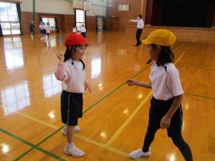 体育科でどんじゃんけんをしました。線の上を走り、出会った友達と元気よくハイタッチをしてからじゃんけんをしました。じゃんけんに勝ったら、相手の陣地にあるコーンにタッチできるように一生懸命に走っていました。子供たちの様子です。