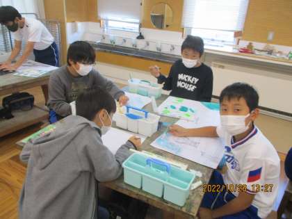 図画工作科では、思い出の風景に色を塗り始めました。水彩の特徴を生かしながら描こうとがんばっていました。