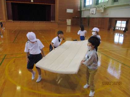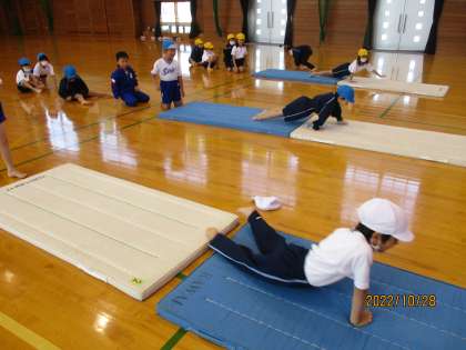 体育科の学習で、マットを使った運動を楽しんでいます。ねこちゃん体操や動物歩きなど、マットを楽しんでいます。準備や片付けも協力して行っています。