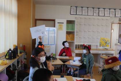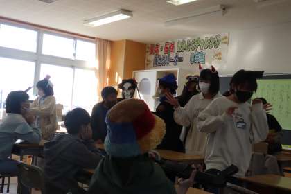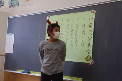 ハロウィンパーティー1(6年生) 公開日 2022/11/14 更新日 2022/11/14 6年生 今日は、10日遅れのハロウィンパーティーをしました。「かぶっちゃやーよゲーム」や「絵伝言ゲーム」等でチームで楽しみました。