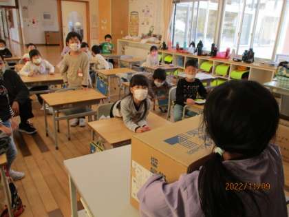 四角や丸など、いろいろな形のものを、手で触ってどんな形か当てるゲームをしました。角や面の形を頼りに形を当てていました。