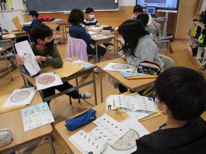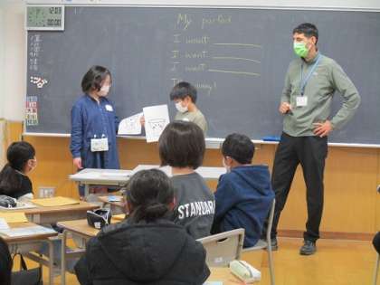 外国語の学習では、ペアの人にピザやパフェを作ってもらい、どんなピザやパフェが完成したかを英語で発表しました。