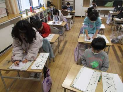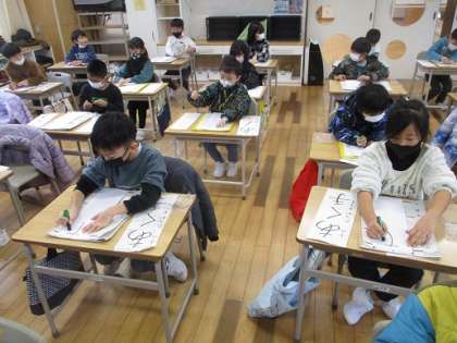 真剣な表情で書き初めの用紙に向かい「あく手」と書きました。
