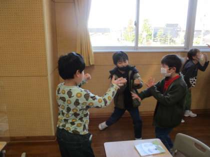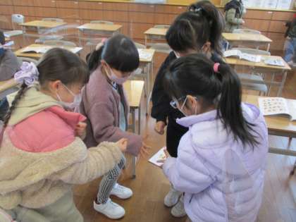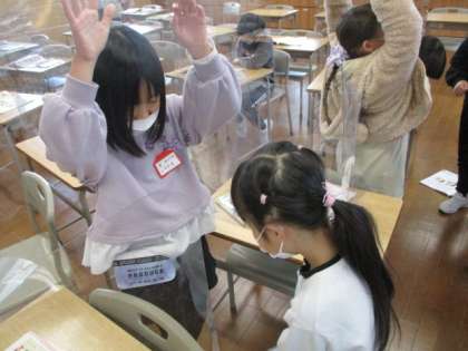 音楽科の学習で、「おちゃらかほい」の歌遊びを行いました。友達と一緒に歌いながら、音楽に合わせてじゃんけんをして楽しんでいました。子供たちの様子です。