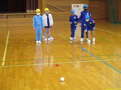 今日はボッチャという競技に挑戦しました。初めての子がほとんどで、ボールを投げたり転がしたりする力加減が難しそうでした。チームの仲間と一喜一憂しながら楽しんで活動していました。