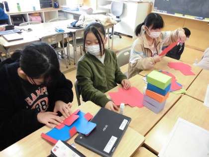 卒業プロジェクト 学校チーム (6年生) 公開日 2023/02/17 更新日 2023/02/17 6年生 学校チームは、地域の人等に贈るプレゼント作りに励んでいます。丁寧に箱を作ったり、心のこもった手紙を書こうとがんばったりしていました。