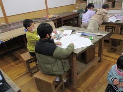 生活科で、昔の遊びを学習しました。凧あげの凧に絵を描いたり、組み立てたりしている子供たちの様子です。