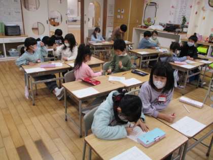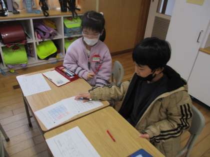 算数で、どちらが広いの学習を行いました。隣のペアの友達と、じゃんけんをして、陣を取り合い、どちらが広いかを確かめました。