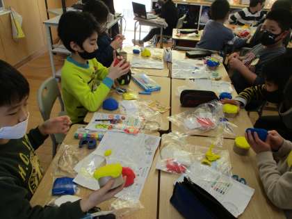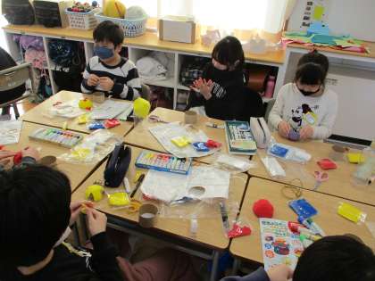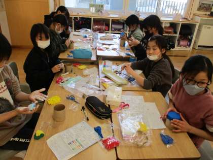 空きようきを使って、ペン立てや小物入れを作っています。粘土を混ぜて、自分のイメージに合うような色や形に仕上げています。