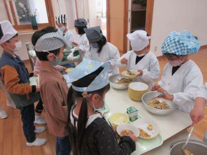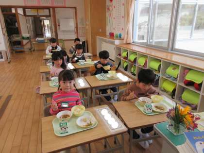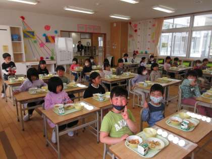 今日から給食がスタートしました。給食の準備の仕方を学び、給食当番や台ふきなどの仕事に責任をもって取り組みました。子供たちは、「みんなで食べた給食は、とても美味しくて楽しかった」と話していました。