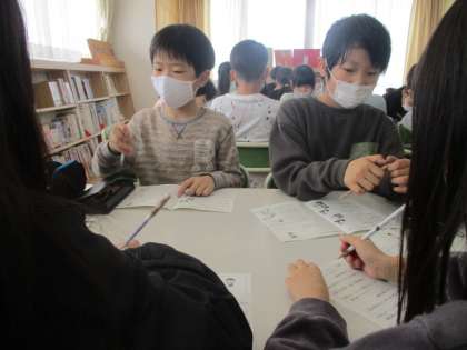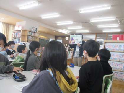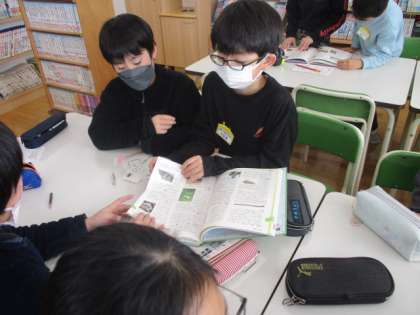 学校の図書室のオリエンテーションを行いました。図書室の使用方法や百科事典の引き方を学習している子供たちの様子です。