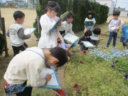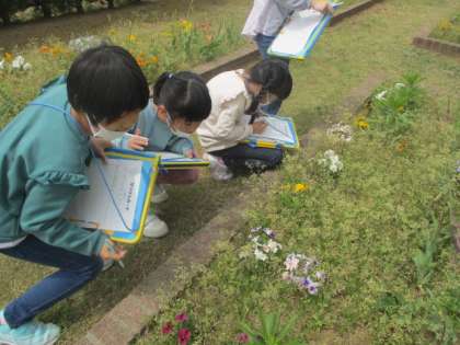 生活科 グラウンド探検(1年生) 公開日 2023/04/24 更新日 2023/04/24 1年生 今日は生活科の学習で、グラウンドの危険箇所を確認したり、グラウンドにある遊具や花壇などを見付けたりしました。生活科バックを使って、三成っ子花壇に咲いている花を描いている子供たちの様子です。