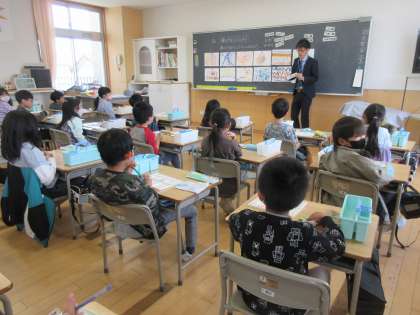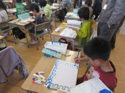 今日の学習参観では、図画工作科の学習をしました。線や点、絵の具の濃さ、筆の太さを工夫して作品を完成させました。