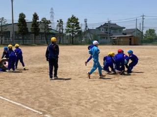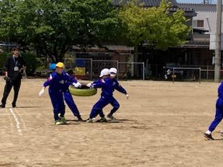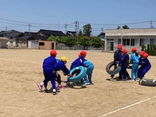 運動会の練習でタイヤ引きを行いました。自分たちで作戦を考えながら取り組んでいる子供たちの様子です。