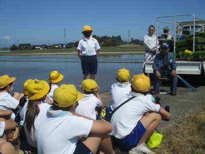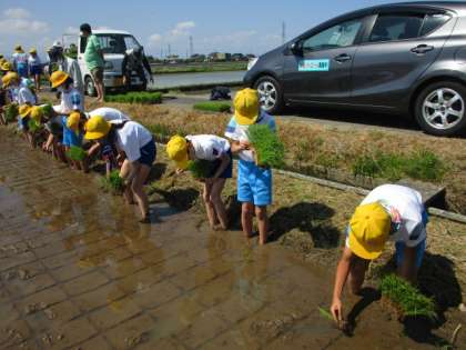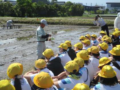 田植え1 (5・6年生) 公開日 2023/05/11 更新日 2023/05/11 6年生 旧上条小学校横の田んぼで田植えを体験しました。地域の方々からやり方を聞いた後、田んぼに入った子どもたちは、足から伝わる感触を楽しんでいました。