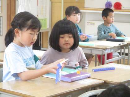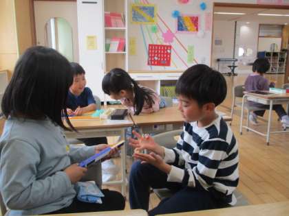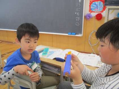 算数科 10はいくつといくつ(1年生) 公開日 2023/05/15 更新日 2023/05/15 1年生 10個並んでいるブロックを使って、ブロックがいくつ隠れているか友達と問題を出し合いました。ブロックの数を数えたり、指を使ったりして、問題に答えようと取り組みました。