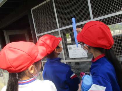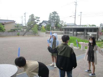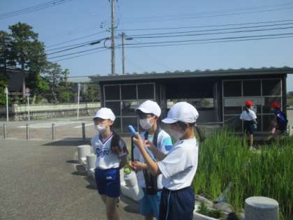 理科の学習で1日の気温の変化を調べています。約1時間ごとに気温をはかりました。子供達の様子です。