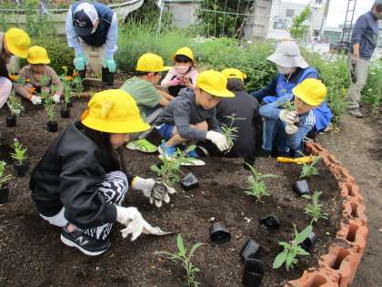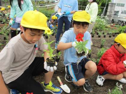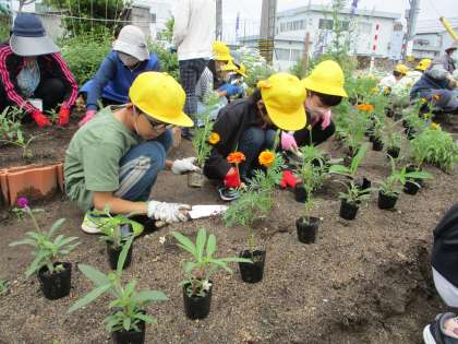 地域の方に教えていただいてフラワーパークに花苗を植えました。貴重な体験に子供たちも楽しそうでした。