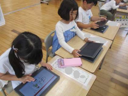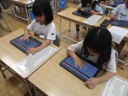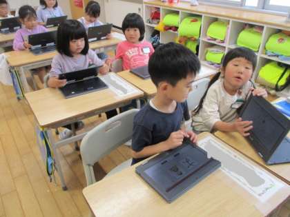 クロームブックで学習(1年生) 公開日 2023/06/02 更新日 2023/06/02 1年生 クロームブックを使ってひらがなの学習をしました。サイトを開くことも一苦労の子供たちでしたが、友達と協力して目的のページを開き、好きな文字を書いたり、「あ」の練習をしたりしました。指で文字を書くのが大変でしたが、花丸をもらえて嬉しそうな子供たちの様子です。