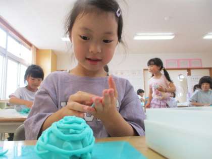 ひもひもねんど(1年生) 公開日 2023/06/22 更新日 2023/06/22 1年生 図画工作科「ひもひもねんど」では、ねんどをひものように伸ばしてからさまざまな物に変身させました。ひもの形を生かして、へびやちんあなご、モンブランや魚など、いろんなものに姿を変えていました。