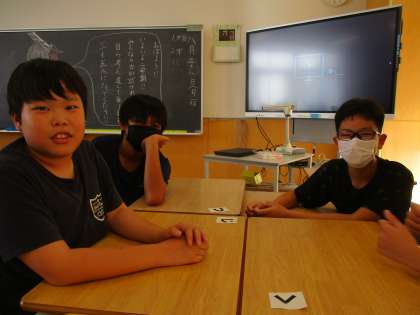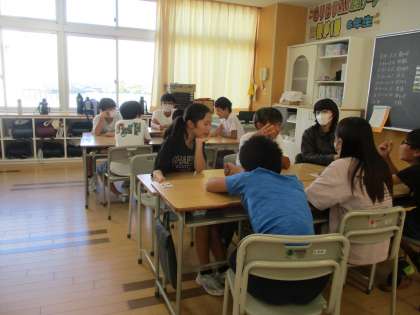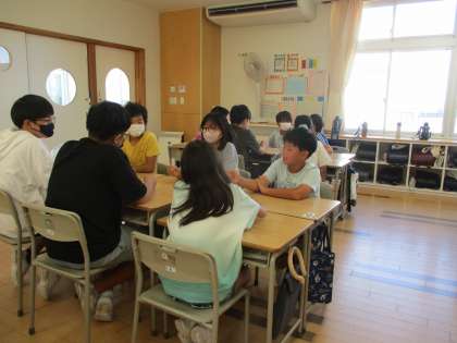 いよいよ2学期がスタートしました。始業式を終え、子供たちは、グループで夏休みの思い出を語り合いました。
