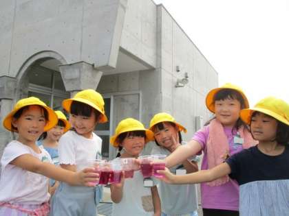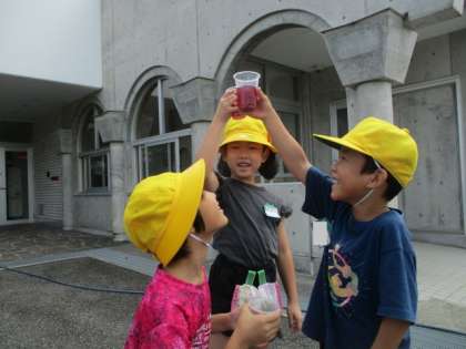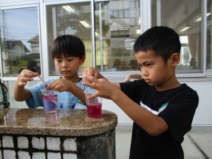 図画工作科 オリジナル色水をつくろう(1年生)1 公開日 2023/09/20 更新日 2023/09/20 1年生 しおれた朝顔の花を、水に浸けたり揉んだりして、色水を作りました。花の数や水の量を調整してオリジナルの色水ができあがりました。