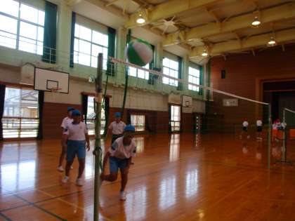 体育では、ビーチバレーボールの学習を行ってきました。チームで十分につながるようになり、互いに声を掛け合いながら試合を行っていました。