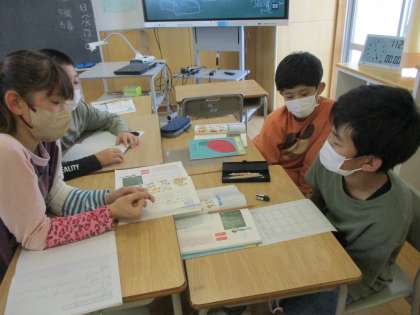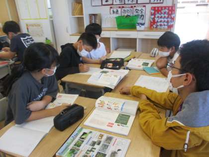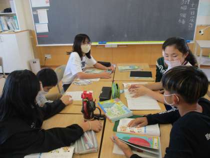 国語科(6年生) 公開日 2023/10/12 更新日 2023/10/12 6年生 国語科「みんなで楽しく過ごすために」の学習では、5年生と楽しく過ごすための遊びをグループで話し合いました。力の差やみんなが楽しめるというキーワードをもとに真剣に考えていました。