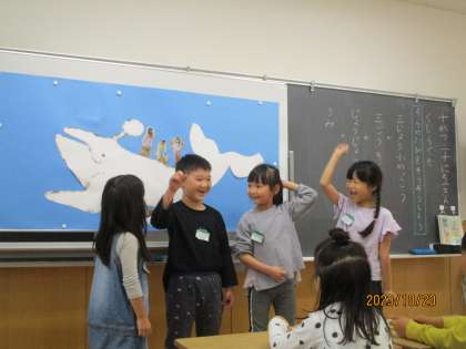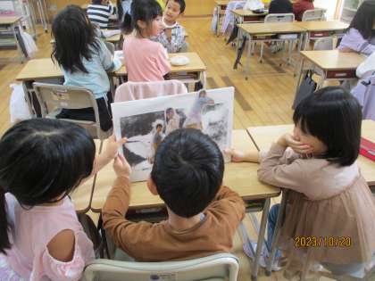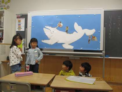 グループになって、くじらぐもの空の旅を想像しました。「○○が見えるよ」「○○がいるよ」等と空の旅を楽しみました。
