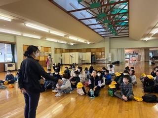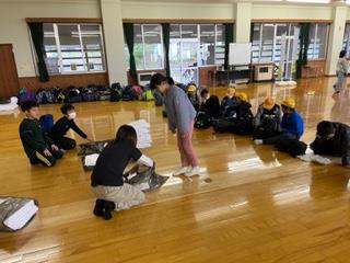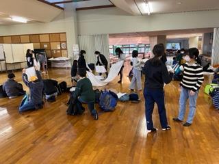 宿泊学習2日目の朝の様子。天気は晴れです。 子供たちはシーツを返し、朝の打ち合わせをしています。