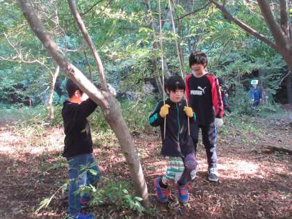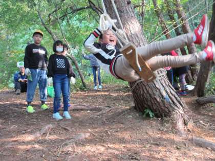 4・5年生宿泊学習(富山市教育活動センター)03 公開日 2023/10/28 更新日 2023/10/28 三成っ子 次に、ワイルド遊びをしました。 森の中で、ロープと木の枝だけを使い、楽しい遊び道具を作りました。