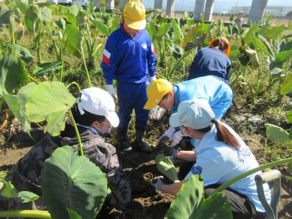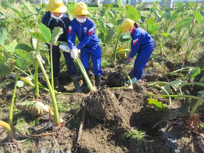 里芋を掘り起こすのは、とても力のいる作業でした。友達と一緒に引っ張ったり、親芋から小芋や孫芋を一つ一つ取り外したりと、収穫の苦労を感じながら作業を進めていました。