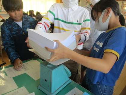 算数科 (6年生) 公開日 2023/11/07 更新日 2023/11/07 6年生 算数科の学習では、比例の関係を利用しておよその紙の枚数を求める学習をしました。紙の重さや高さ等、自分たちで決めた基準で求めていました。