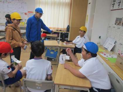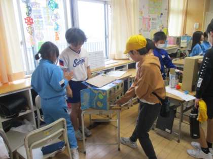 総合の学習で、ゴミになってしまう物を再利用し、わなげやつりなどを工作しました。工作した物を使ってエコアイランドを開催し、6年生を招待しました。6年生に楽しんでもらえて、満足している様子でした。