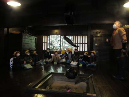 11月24日(金)、3年生は、富山市民俗民芸村に校外学習に出かけました。石臼やわら靴等、昔の人々が使っていたものを実際に見たり、使ったりすることができました。いろりでは、煙のにおいが漂う部屋で話を聞きました。