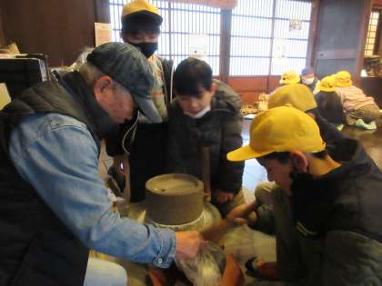 校外学習(3年生) 公開日 2023/11/27 更新日 2023/11/27 3年生 11月24日(金)、3年生は、富山市民俗民芸村に校外学習に出かけました。石臼やわら靴等、昔の人々が使っていたものを実際に見たり、使ったりすることができました。いろりでは、煙のにおいが漂う部屋で話を聞きました。